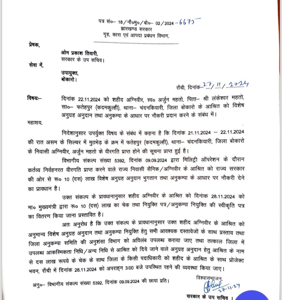 बोकारो: 22.11.2024 की रात असम के सिल्वर में मुठभेड़ में बोकारो जिला अंतर्गत चंदनकियारी प्रखंड की सिलफोर पंचायत के फतेहपुर निवासी अर्जुन कुमार महतो वीरगति को प्राप्त हुए थे।अब 5 दिन के अंदर ही शहीद के आश्रित को विशेष अनुग्रह अनुदान तथा अनुकम्पा के आधार पर नौकरी प्रदान करने का मुख्यमंत्री हेमंत सोरेन ने निर्देश दिया है।शहीद अर्जुन महतो के परिजनों को 10 लाख का मुआवज़ा और एक आश्रित को अनुकंपा के आधार पर नौकरी का आदेश जारी कर दिया गया है।