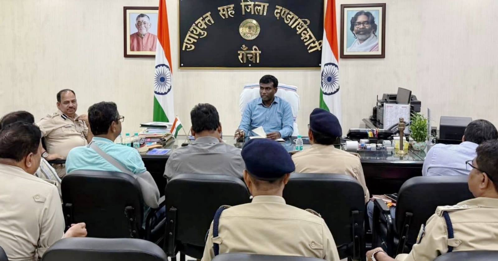 रांची : उपायुक्त सह जिला दंडाधिकारी राँची, श्री मंजुनाथ भजन्त्री की अध्यक्षता में आज कार्यालय कक्ष में आगामी दुर्गापूजा 2025 के दौरान विधि-व्यवस्था, साफ-सफाई, बिजली आपूर्ति, ट्रैफिक मैनेजमेंट, और पंडालों में सुरक्षा को लेकर जिला के वरीय पदाधिकारियों के साथ एक महत्वपूर्ण बैठक आयोजित की गई।इस बैठक में कई अहम दिशा-निर्देश जारी किए गए ताकि पूजा का आयोजन सुचारू, सुरक्षित और व्यवस्थित ढंग से संपन्न हो।बैठक में वरीय पुलिस अधीक्षक राँची, श्री चंदन कुमार सिन्हा, अपर जिला दंडाधिकारी (विधि-व्यवस्था), श्री राजेश्वर नाथ आलोक, पुलिस अधीक्षक (शहर) राँची, श्री अजीत कुमार, पुलिस अधीक्षक (ग्रामीण) राँची, श्री प्रवीण पुष्कर, अनुमंडल पदाधिकारी (सदर) राँची, श्री उत्कर्ष कुमार, अपर प्रशासक नगर निगम, सहित सभी पुलिस उपाधीक्षक उपस्थित थे।