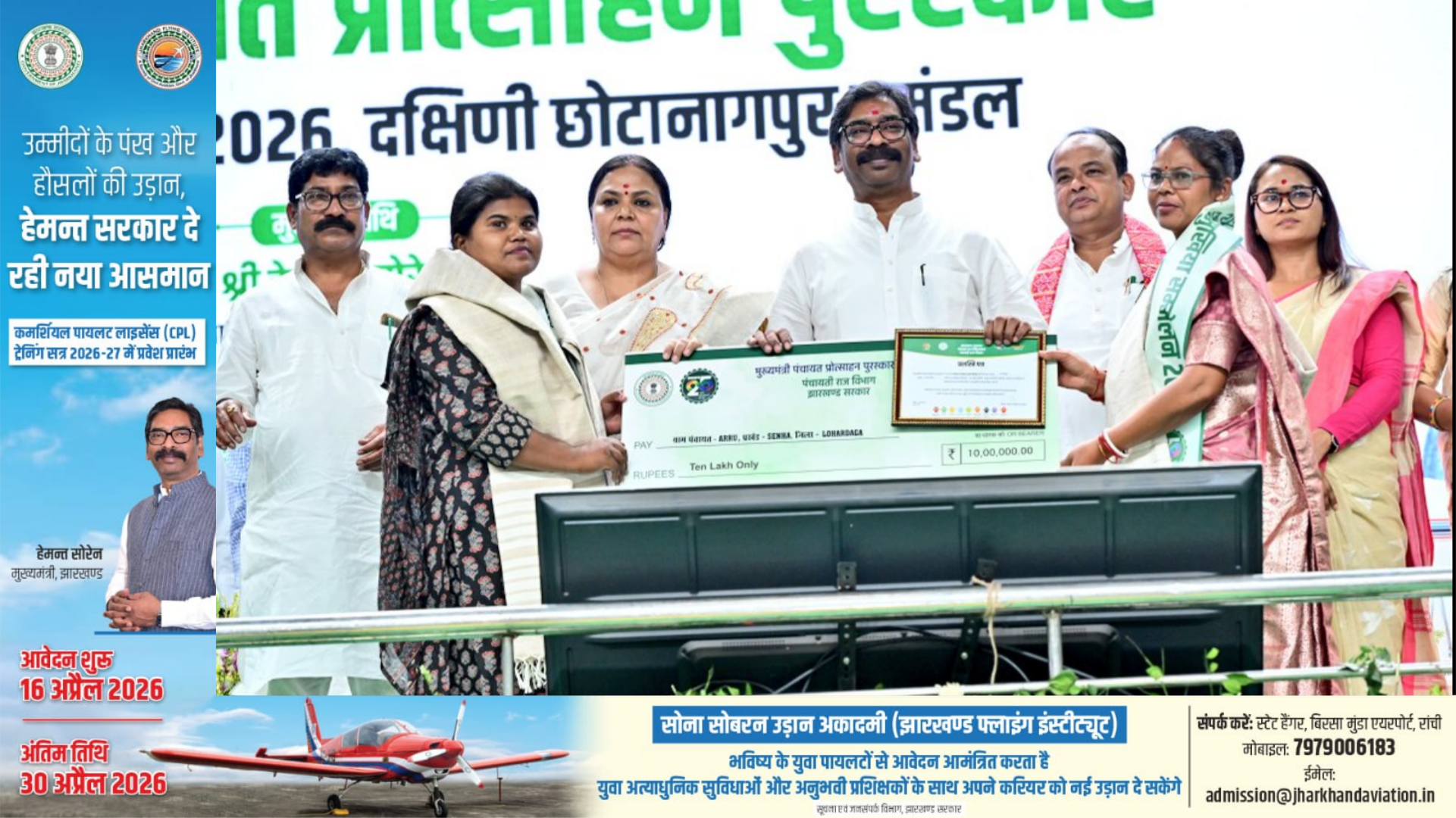 रांची: राष्ट्रीय पंचायती राज दिवस के अवसर पर टाना भगत स्टेडियम, खेलगांव, रांची में आयोजित मुख्यमंत्री पंचायत प्रोत्साहन पुरस्कार सह मुखिया सम्मेलन 2026 कार्यक्रम में सीएम हेमंत सोरेन शामिल हुए।मुख्यमंत्री पंचायत प्रोत्साहन पुरस्कार योजना के तहत कोडरमा को राज्य की उत्कृष्ट जिला परिषद के रूप में चयनित किया गया है. रांची में आयोजित एक गरिमामय समारोह में मुख्यमंत्री हेमंत सोरेन ने जिला परिषद को 20 लाख रुपये की प्रोत्साहन राशि सौंपी. इसके साथ ही जिले की चार अन्य पंचायतों को भी विभिन्न श्रेणियों में सम्मानित किया गया.