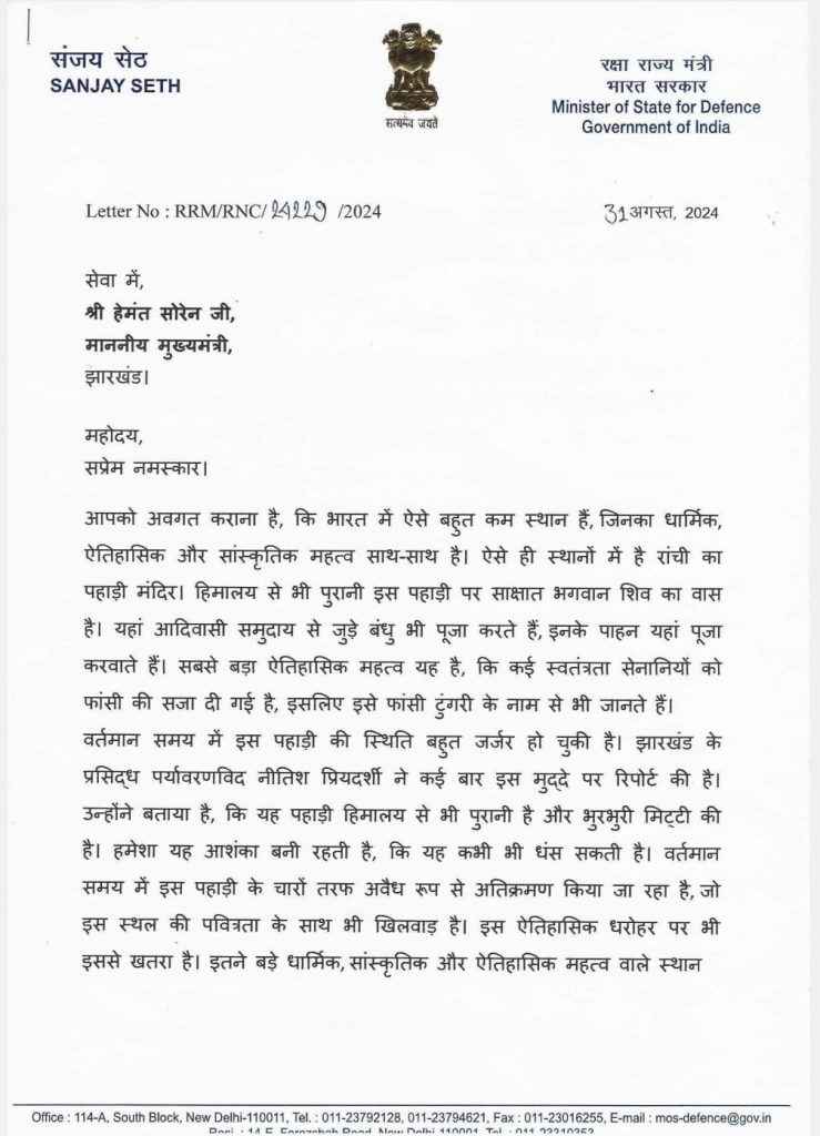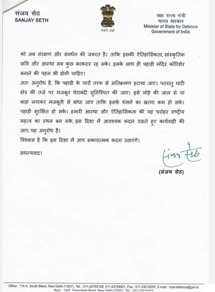 पहाड़ी मंदिर को लेकर सीएम को संजय सेठ ने लिखा पत्र,कहा ”इसे अतिक्रमण मुक्त कराया जाए…धंसने की आशंका बनी रहती है”