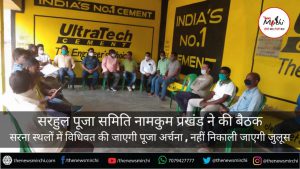 आज सरहुल पूजा समिति नामकोम प्रखण्ड के तत्वाधान में एक बैठक किया गया, जिसकी अध्यक्षता बिरसा पहान ने किया। इस बैठक में आगामी 15 अप्रैल को चैत् तृतीय को प्रकृति महापर्व सरहुल पूजा को लेकर चर्चा की गयी । वैश्विक महामारी कोरोना वायरस के बढ़ते संक्रमण और झारखण्ड सरकार की दिशा निर्देश को देखते हुए। इस वर्ष सरहूल शोभायात्रा को नही निकालने का फैसला लिया गया है। नामकोम प्रखण्ड के सभी गाँवो के सरना स्थलों में पहान के द्वारा विधिवत पुजा अर्चणा किया जाऐगा।